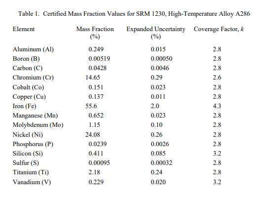 被測量是 SRM 1230 中每種成分的認證值。認證值在表 1 中提供,并以質量分數報告 [1]。隨數值列出的不確定度是擴展不確定度,U = kuc,基于 95% 置信水平 [2],根據 ISO/JCGM 指南 [3] 中的方法計算。 NIST 認證值是 NIST 對其準確性具有最高置信度的值,因為所有已知或可疑的偏差來源都已被調查或考慮 [4]。認證值是根據 NIST 和合作實驗室進行的分析結果對“真實”值的當前最佳估計。用于確定成分的測試方法在附錄 A 和隨附的關鍵字中確定。計量溯源性是導出的 SI 單位的質量分數(以百分比表示)。