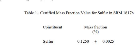 SRM 1617b 硫含量的認(rèn)證值在表 1 中以質(zhì)量分?jǐn)?shù) [2] 的形式報(bào)告。NIST 認(rèn)證值是 NIST 對(duì)其準(zhǔn)確性有最高置信度的值,因?yàn)樗幸阎幕驊岩傻钠衼?lái)源已被調(diào)查或考慮 [3]。認(rèn)證值是根據(jù) NIST 和合作實(shí)驗(yàn)室使用儀器測(cè)試方法進(jìn)行的分析結(jié)果對(duì)真實(shí)值的當(dāng)前最佳估計(jì)。