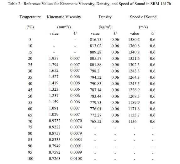 表 2 給出了 SRM 1617b 的運(yùn)動(dòng)粘度、聲速和密度的參考值。NIST 參考值是未經(jīng)認(rèn)證的值,它是基于可用數(shù)據(jù)對(duì)真實(shí)值的最佳估計(jì);但是,該值不符合 NIST 認(rèn)證標(biāo)準(zhǔn) [3],并提供了相關(guān)的