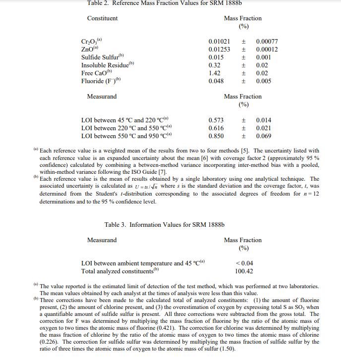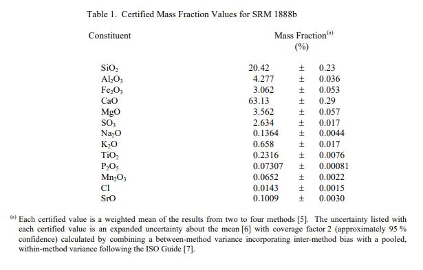 NIST SRM 1888b 硅酸鹽水泥(標(biāo)準(zhǔn)品)表 3 中報(bào)告了兩個(gè)信息值。信息值被認(rèn)為是 SRM 用戶感興趣的值,但沒有足夠的信息來(lái)評(píng)估與值相關(guān)的不確定性 [2]。
