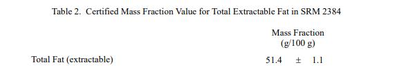 表 1 和表 2 中提供了 SRM 2384 中元素和脂肪的認(rèn)證質(zhì)量分?jǐn)?shù)值。NIST 認(rèn)證值是 NIST 對(duì)其準(zhǔn)確性的最高置信度值,因?yàn)樗幸阎蚩梢傻钠顏?lái)源已考慮[1]。進(jìn)行了價(jià)值分配分析由 NIST 和合作實(shí)驗(yàn)室提供。認(rèn)證的質(zhì)量分?jǐn)?shù)值計(jì)算為 NIST 方法的平均值和合作實(shí)驗(yàn)室進(jìn)行的平均測(cè)量值的中位數(shù)或平均值(如果適用)。相關(guān)的不確定性以大約 95% 的置信水平表示 [2,3]。數(shù)值以質(zhì)量分?jǐn)?shù)單位 [4] 以原樣(非干質(zhì)量)為基礎(chǔ)報(bào)告。