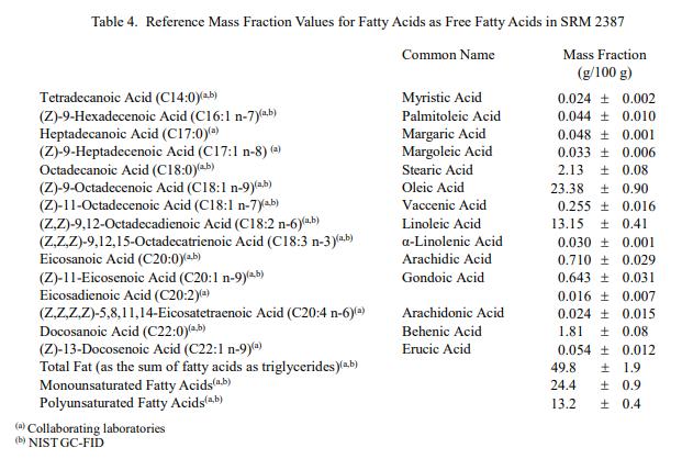 表 1 至表 3 中提供了 SRM 2387 中脂肪、元素和生育酚的認證質(zhì)量分數(shù)值。NIST 認證值是 NIST 對其準確性有最高置信度的值,因為所有已知或懷疑偏差的來源已被考慮 [1]。價值分析分配由 NIST 和合作實驗室完成。該材料中的認證質(zhì)量分數(shù)值計算為 NIST 方法的平均值和合作實驗室進行的測量的平均值(如果適用)。相關(guān)的不確定性以大約 95% 的置信水平表示 [2-4]。數(shù)值以質(zhì)量分數(shù)單位 [5] 以原樣(非干質(zhì)量)為基礎(chǔ)報告。