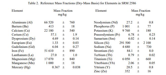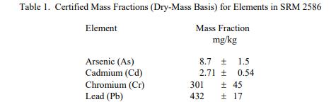 NIST SRM 2586涂料中含鉛土壤中的微量元素(標(biāo)準(zhǔn)品)旨在用于評(píng)估測(cè)定土壤中鉛、微量元素和全氟辛烷磺酸 (PFOS) 的分析方法。 SRM 2586 是從城市地區(qū)收集的土壤樣本的混合混合物,據(jù)信鉛的主要來(lái)源來(lái)自舊房子的含鉛涂料。所有值均以質(zhì)量分?jǐn)?shù) [1] 的形式報(bào)告,以干重為基礎(chǔ),并且基于使用至少 200 mg 樣品質(zhì)量的測(cè)量值。一個(gè) SRM 2586 單元由大約 55 克粒徑<75 微米(200 目)的材料組成。