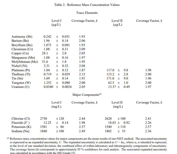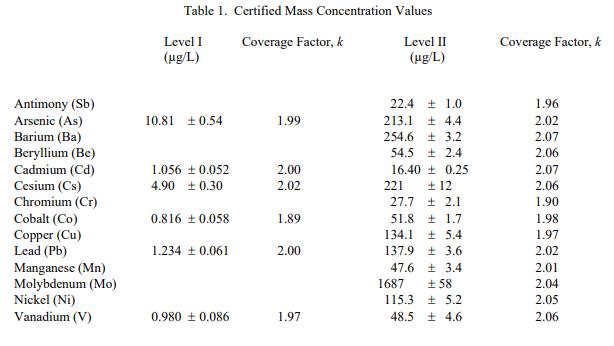 表 1 列出了 SRM 2668 的 I 級(jí) 6 種元素和 II 級(jí) 14 種元素的認(rèn)證質(zhì)量濃度值。 NIST 認(rèn)證值是 NIST 對(duì)其準(zhǔn)確性有最高信心的值已知或可疑的偏見來源已被調(diào)查或考慮帳戶 [1]。數(shù)值來自 NIST 和合作實(shí)驗(yàn)室提供的結(jié)果的組合。