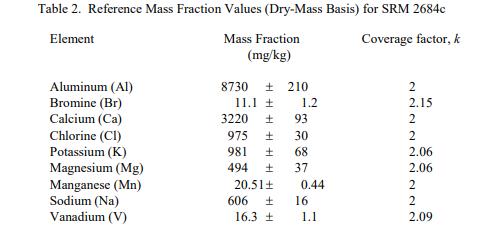 表 2 中提供了鋁、溴、鈣、氯、鎂、錳、鉀、鈉和釩的參考值,以基于干質(zhì)量的質(zhì)量分?jǐn)?shù) [1] 表示。參考值是對真實(shí)價值的最佳估計的非核證價值;然而,價值不符合NIST 認(rèn)證標(biāo)準(zhǔn),并提供了相關(guān)的不確定性,該不確定性可能僅反映測量精度,可能不包括所有不確定性來源 [2]。