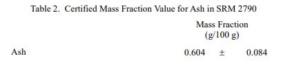 SRM 2790 中元素的認(rèn)證質(zhì)量分?jǐn)?shù)值,以干質(zhì)量為基礎(chǔ)報(bào)告,灰分分別在表 1 和表 2 中提供。 NIST 認(rèn)證值是 NIST 對(duì)其準(zhǔn)確性具有最高置信度的值,因?yàn)樗幸阎蚩梢傻钠顏?lái)源都已被調(diào)查或考慮在內(nèi) [1]。 NIST 進(jìn)行了賦值分析。認(rèn)證的質(zhì)量分?jǐn)?shù)值計(jì)算為 NIST 方法的平均值的平均值。相關(guān)的不確定性以大約 95% 的置信水平表示 [2-4]。