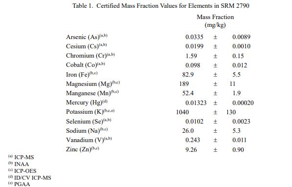 表 3 中提供了 SRM 2790 中其他元素的參考質(zhì)量分?jǐn)?shù)值,以干質(zhì)量為基礎(chǔ)報(bào)告。NIST 參考質(zhì)量分?jǐn)?shù)值是未經(jīng)認(rèn)證的值,它是基于真實(shí)值的最佳估計(jì)關(guān)于可用數(shù)據(jù);但是,這些值不符合 NIST 標(biāo)準(zhǔn)