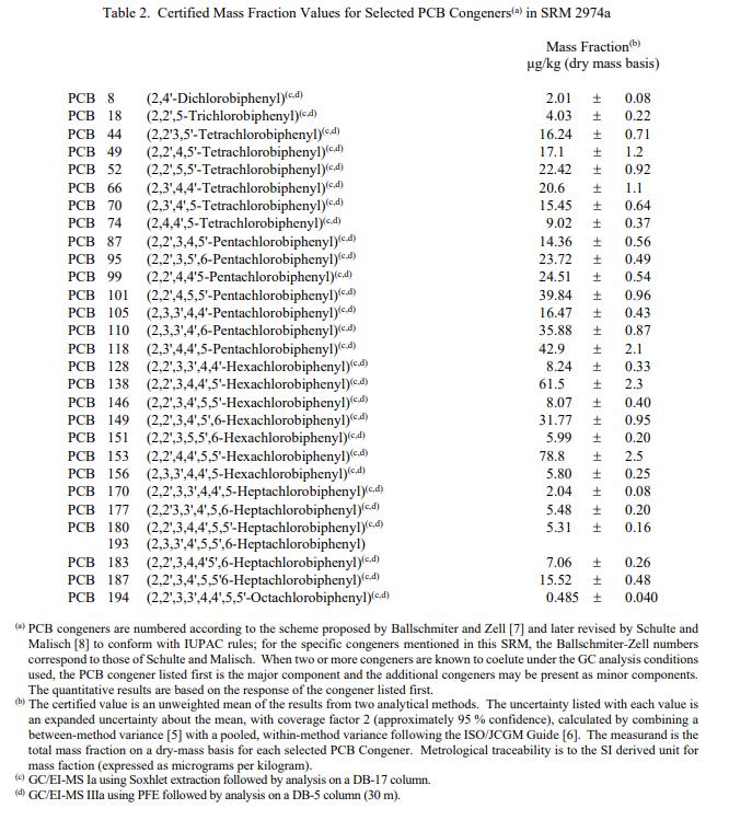 表 1 至表 1 提供了以質(zhì)量分?jǐn)?shù)表示的 22 種 PAH(一些組合)、29 種 PCB 同族物(一些組合)、八種氯化農(nóng)藥和六種 PBDE 同族物(一些組合)的認(rèn)證值4、分別。甲基汞、無(wú)機(jī)汞和總汞的認(rèn)證值在表 5 中提供。NIST 認(rèn)證值是 NIST 對(duì)其準(zhǔn)確性有最高置信度的值,因?yàn)樗幸阎蚩梢傻钠顏?lái)源都已調(diào)查或考慮在內(nèi)[1]。認(rèn)證值基于 NIST 使用多種分析技術(shù)獲得的結(jié)果的一致性。