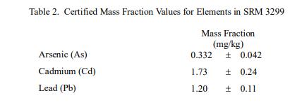 表 1 和表 2 提供了 SRM 3299 中姜黃素和元素的認證質量分數值,以干質量為基礎報告。NIST 認證值是 NIST 對其準確度有最高置信度的值因為所有已知或可疑的偏見來源都已被調查或采取考慮[1]。價值分配分析由 NIST 和合作實驗室進行。認證值計算為 NIST 方法平均值的未加權平均值和合作實驗室平均值的加權中值(在適當的情況下)。相關的不確定性以大約 95% 的置信水平表示 [2-4]。