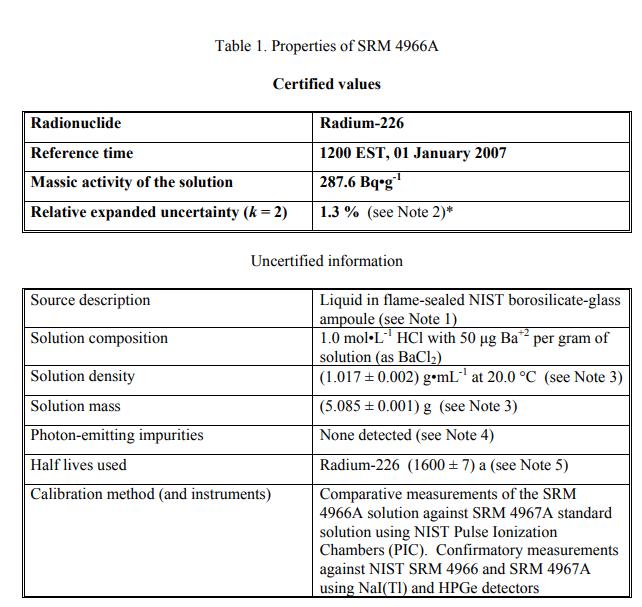 在 2007 年 1 月 1 日美國東部標準時間 1200 的參考時間,經認證的 Radium-226 質量活度值為:(287.6 ± 3.7) Bq?g-1