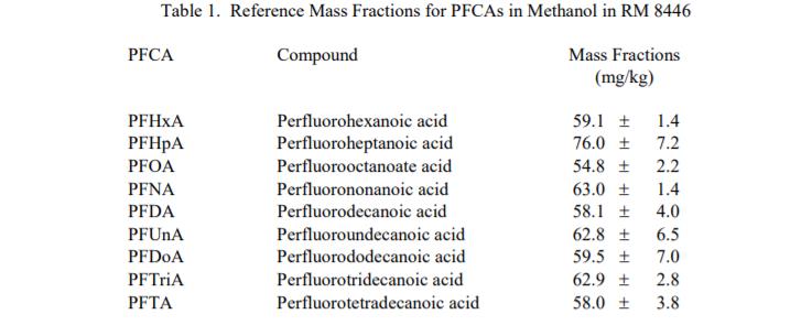 PFCA 和 PFOSA 的參考質(zhì)量分數(shù):表 1 中給出了參考質(zhì)量分數(shù)值甲醇中的 PFCA 和表 2 中甲醇中的 PFCA 和 PFOSA。這些值基于從溶液的重量法制備獲得的結(jié)果和使用液相色譜法確定的分析結(jié)果。參考值是對真實值的最佳估計的非認證值;但是,這些值不符合 NIST 認證標(biāo)準(zhǔn),并且提供了可能反映的相關(guān)不確定性僅測量精度,可能不包括所有不確定性來源,或者可能反映多種分析方法之間缺乏足夠的統(tǒng)計一致性 [1]。