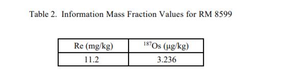 表 2 中提供的 Re 和 187O 的信息值是未經(jīng)認證的值,沒有報告不確定性。信息值 [1] 被認為是 RM 用戶感興趣的值,但沒有足夠的信息來評估與該值相關的不確定性。