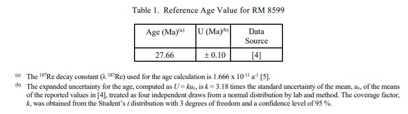 表 1 中提供了 Henderson 輝鉬礦的參考年齡。參考值 [1]是一個未經(jīng)證實的值,它是對真實值的最佳估計;但是,該值不符合 NIST 的認證標準,并且提供了相關的不確定性,這些不確定性可能僅反映測量精度,可能不包括所有不確定性來源。