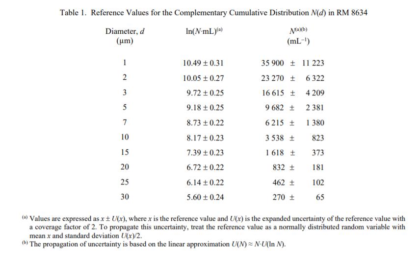 NIST 參考值是未經認證的值,它是基于可用數據對真實值的最佳估計;然而,該值不符合 NIST 的認證標準,并且提供了相關的不確定性,可能僅反映測量精度,可能不包括所有不確定性來源,或者可能反映多種分析方法之間缺乏足夠的統計一致性 [1,2 ]。表 1 和表 2 中提供了粒度分布和形態參考值。這些值在計量上可溯源至使用的測量方法和校準程序